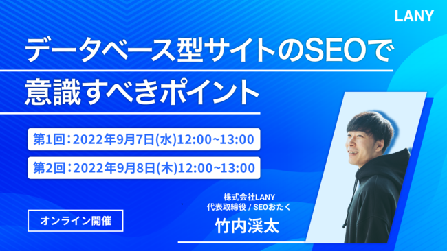 SEOコンサルティングを提供する株式会社LANY(東京都渋谷区、代表取締役社長:竹内渓太)は、【LANY流】データベース型サイトのSEO改善メソッドに関するウェビナーを2022年9月7日(水)、9月8日(木)に開催いたします。