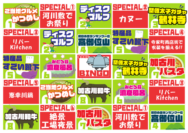 「劇団スカッシュ」メンバーのうち3人が、加古川市の名物を体験して36時間以内にBINGO達成を目指す動画「BINGOの旅in加古川市」を撮影し、その動画を2022年11月25日(金)から5週連続で公開する企画です。達成を目指すビンゴのマス目は、8種類の加古川名物と6種類のスペシャルチャレンジで構成されています。8種類の加古川名物には、「かつめし」、「加古川和牛」といったグルメから、特産品の「靴下」、美しい景色が楽しめる「高御位山」など、加古川が誇る魅力的な名物、スポットがピックアップされています。少しマニアックなスペシャルチャレンジには加古川の河川敷でのイベント参加や、カヌー体験、加古川ご当地グルメ鍋「恵幸川鍋」作りなどの魅力的な体験を織り交ぜています。