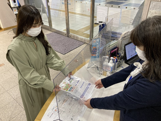 JR加古川駅構内のまち案内所で、先着100名様に、遊び方を記載したチラシとともに配布しましたが、好評のうちに100枚全て配布が完了いたしました。