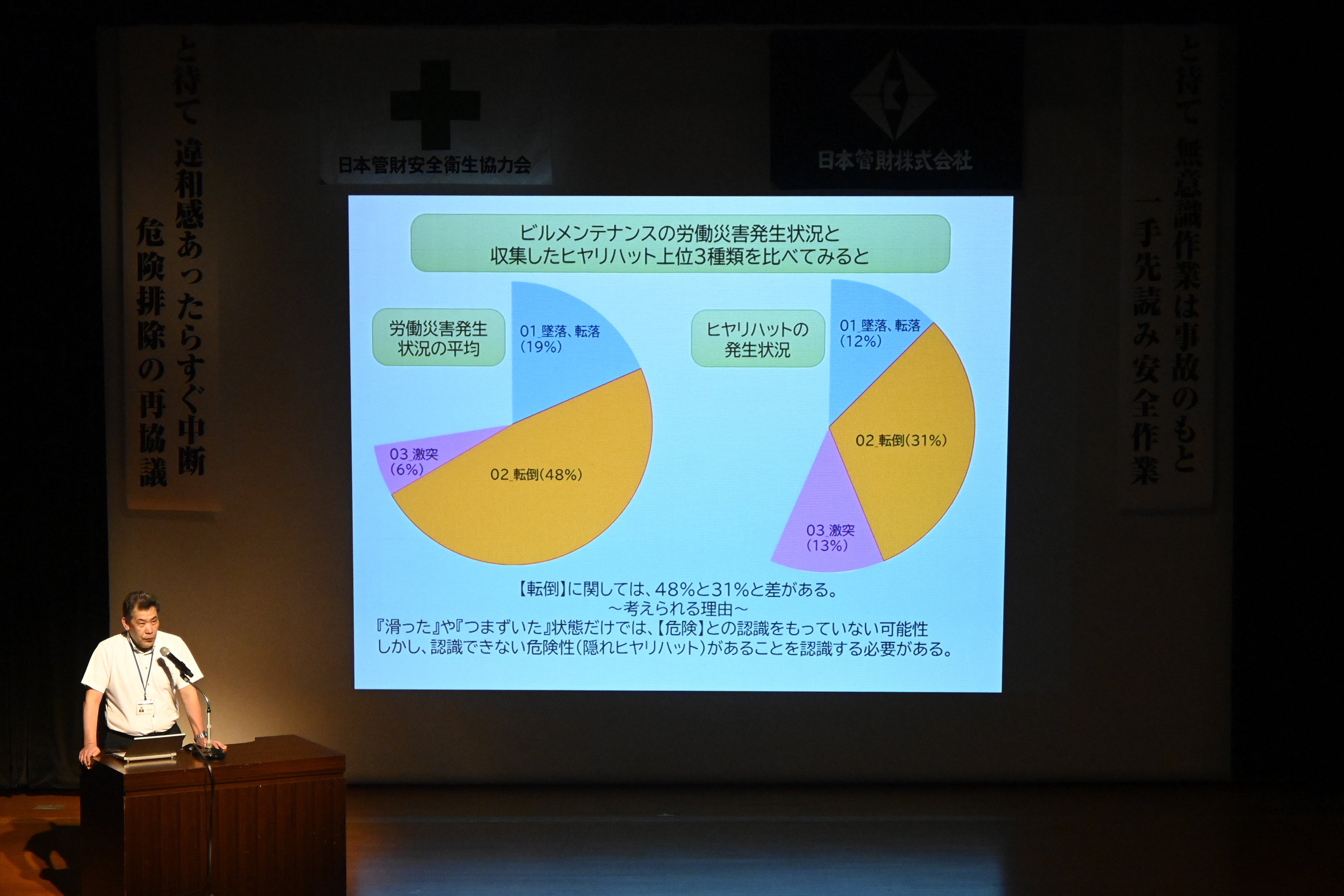 中央労働基準監督署署長による来賓挨拶では、2つの心理的効果を例に、「安全を意識することで、現場の危険やリスクに気づきやすくなる」、「安全は他人事ではなく自分事として考えるべき」とお話いただきました。その他、本安全大会のスローガン優秀賞受賞者への表彰式や、会員企業により収集したヒヤリハット事例の結果報告、特別講演を行いました。