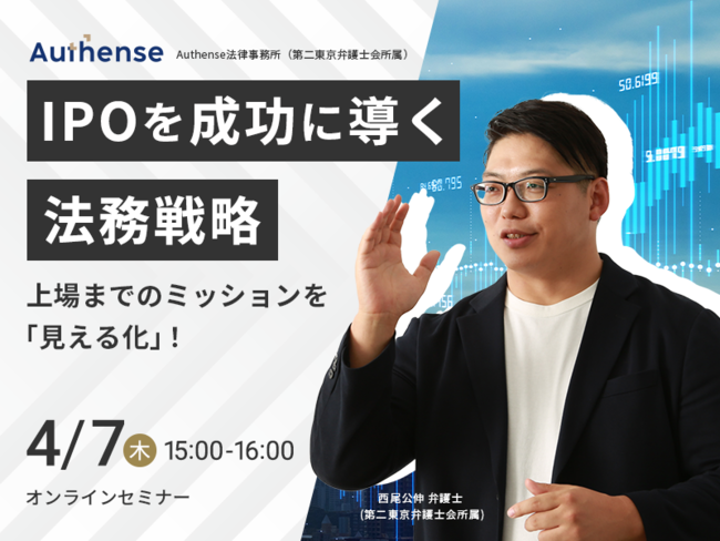 Authense法律事務所(東京都 港区)は、「IPOを成功に導く法務戦略 成長ステージごとに注意すべきポイント」と題したオンラインセミナーを開催いたします。スタートアップ・ベンチャー企業が直面する数多くの課題のうち、特に上場までに確認すべき法務課題について、多くの企業の課題を解決に導いてきた西尾公伸弁護士が、事例を紹介しながら、詳しく解説いたします。