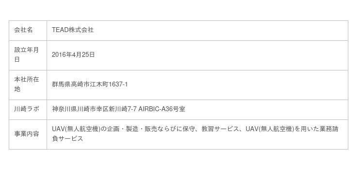 TEAD株式会社、パナソニック システムデザイン株式会社、東京航空計器株式会社の三社は、「あらかじめ決められた地点における物体の検知」と「前回撮影した写真との差分を識別」、「携帯電話ネットワークを使って遠隔地に伝送する」システムを開発。ドローンは東京航空計器株式会社の国産「GNAS SKYクワッドマルチコプタ・固定ピッチモデル」を使用し、カメラは株式会社ザクティの「CX-GB400」光学ズームジンバルカメラを装備。また、機体にはアドバンテック株式会社製のコンパニオンコンピューターを搭載し、AIを使って撮影した映像から物体の検知と差分解析を行っている。