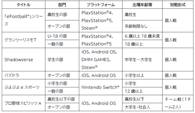 ※「eFootball™」については、大会予選〜本戦期間中にソフト更新の可能性があるため「シリーズ」表記としています。 「PlayStation」および「グランツーリスモ」は、株式会社ソニー・インタラクティブエンタテインメントの商標または登録商標です。 DMMは、合同会社DMM.comの登録商標です。 Steamは、米国及びその他の国のValve Corporationの商標または登録商標です。 Nintendo Switchは任天堂の商標です。
