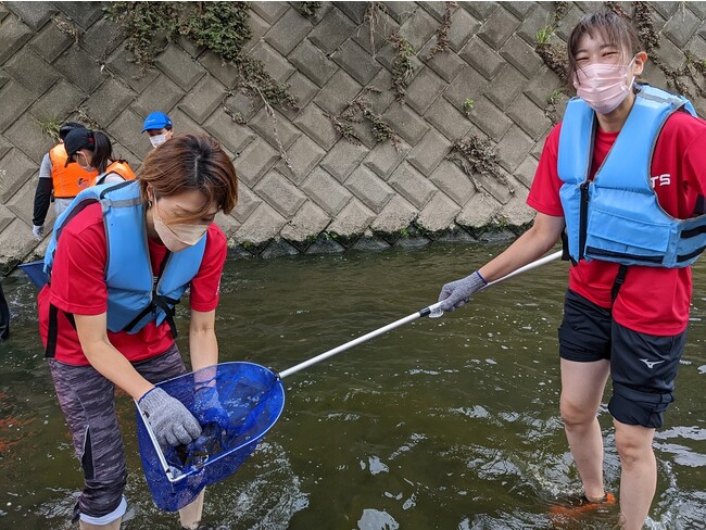 2日目は、矢上川で川の体験授業が行われた。天候にも恵まれ、子どもたちと共に川に入り、矢上川に生息している生き物を調査した。皆で一緒に魚を追い込み、確保する姿、様々場所から楽しんでいる声が聞こえた。