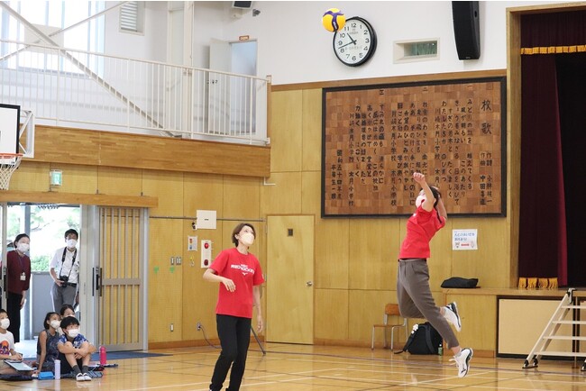 授業の最後には子どもたちにスパイクの迫力を披露し、子どもたちから「ボールが速くてビックリした!」と歓喜の声が上がった。