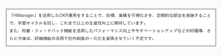 ・簡単に目標の進捗や結果を更新することができて、メンバーが何に注力・貢献すれば良いかが明確になり、上長がマネージメントしやすい環境を準備すること