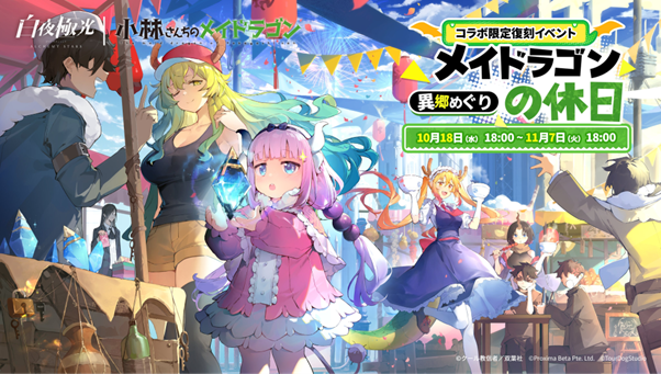 高品質で魅力的なエンターテインメントをお届けするグローバルゲームブランドLevel Infiniteより配信中の『白夜極光(びゃくやきょっこう)』では、10月18日(水)よりコラボイベント【メイドラゴンの休日〜異郷めぐり】を復刻開催します。幻想的かつユニークなストーリー、美しいグラフィック、豪華声優陣による個性豊かなキャラクター等で話題となり、ローンチとともにApp StoreとGoogle Playでランキング1位(※)に輝いた『白夜極光』。再びこの世界へやってきた異世界のドラゴン、トールが、コラボ限定20連召集などサプライズを用意してくれました!そして復刻召集だけでなく、トールたちはイベントストーリーにも登場します。さらに、新光霊【タンドウ】が登場する期間限定イベント【薫風海より来たる】も途中から並行しておこなわれます。ドラゴンと新光霊が共に過ごす休日を、ぜひお楽しみに!