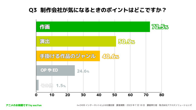 そこで、株式会社アクロスソリューションズと株式会社オークファンが共同運営しているアニメのお時間です!(URL:https://aucfan.com/vod/)は、20歳〜60歳の男女2406人を対象に「アニメ制作会社に関するアンケート調査」を実施しました。