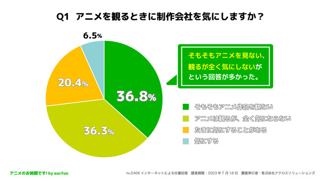 Q1 最も多かった回答は「そもそもアニメ作品を観ない」で36.8%、次点で「アニメは観るが、全く気にならない」が36.3%でした。
