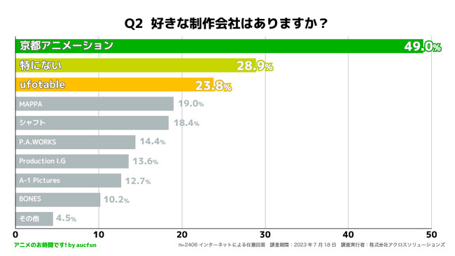 また、好きな制作会社のなかで「京都アニメーション」と答えた人は49%と最も多く、次点で「ufotable」が23.8%、その他では「スタジオジブリ」と答えた人も多く見受けられました。