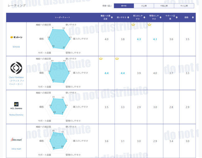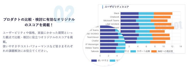 機能への満足度、使いやすさといったユーザーが重視したいポイントや、導入のしやすさ、管理のしやすさ、サポート品質といった管理者が気になるポイントを含め、6つの評価項目をレーダーチャートで可視化しております。
