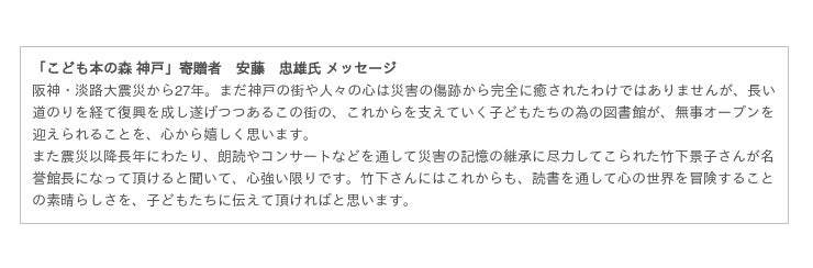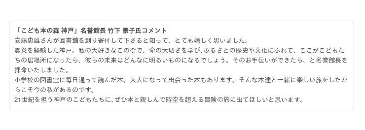 一方、『世界の子どもにワクチンを 日本委員会』の「ワクチン大使」としての活動や小児がんの子どもたちを支援するチャリティー公演への参加など、子どもたちへの思いも深く、様々な活動に携わっておられるところである。「こども本の森 神戸」では施設コンセプトとして“命の大切さと震災の教訓の継承”を掲げており、上記のような竹下氏の活動、神戸市との関わり等を含め最適任者であると判断し、このたび就任を依頼したものである。