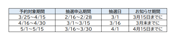2.予約方式:抽選方式+先着予約(抽選予約確定後、キャンセル等で空きが出た場合)