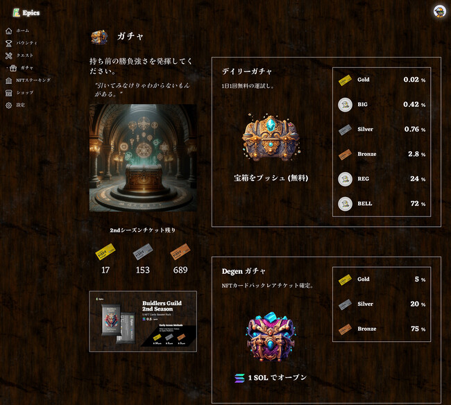 ユーザーは 1 日 1 回無料でデイリーガチャに挑戦できます。このデイリーガチャでは、プラットフォーム上で使用できる NFT カードブースターパックと交換できるレアチケットが当たります。