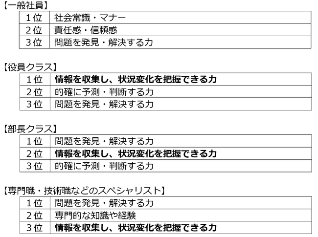 一般社員では、「社会常識・マナー」「責任感・信頼感」など、比較的易しいスキルが求められる一方で、役員クラス・部長クラスのエグゼクティブポジションでは、「情報を収集し、状況変化を把握できる力」「的確に予測・判断する力」「問題を発見・解決する力」など、より難易度の高いスキルが求められ、スペシャリストは専門職ならではの「専門的な知識や経験」を他のポジションよりも求められています。