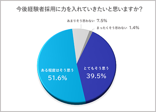 さらに、今後の経験者採用への注力度に関しては「とてもそう思う」39.5%と「ある程度はそう思う」51.6%を合わせて、91.1%が前向きに検討していることが判明しました。