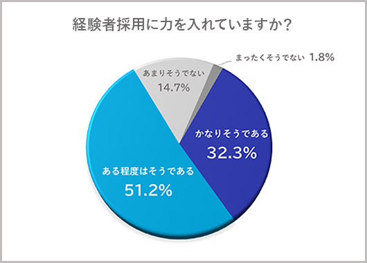 現在の経験者採用の注力度について聞いたところ、力を入れていると回答した企業は、「かなりそうである」32.3%、「ある程度はそうである」51.2%を合わせると全体の83.5%となりました。
