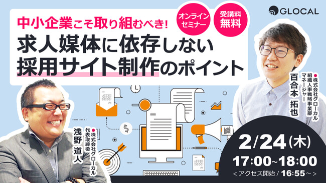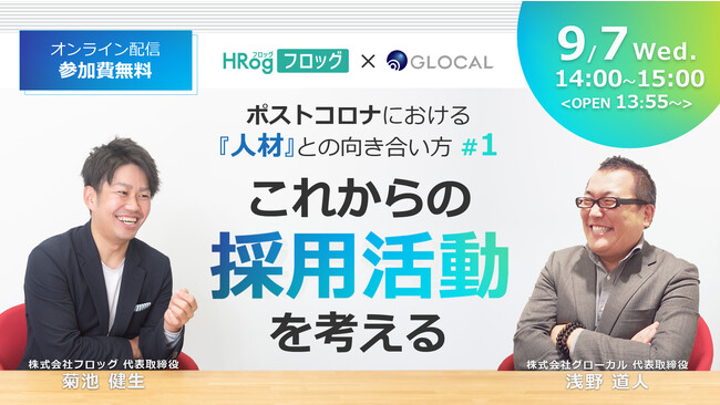 本セミナーでは、人材業界の一歩先を照らすメディア「HRog」を運営する株式会社フロッグの代表取締役・菊池健生氏と、地域の中小企業の経営支援を行う株式会社グローカルの代表取締役・浅野とのパネルディスカッションを通して、経営者や人事責任者が今押さえるべき「これからの採用活動」を紹介いたします。