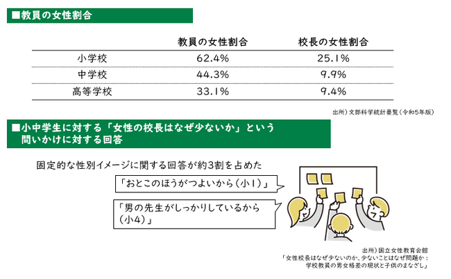 学校教育分野における女性の管理職比率が低いことは、教育を受ける側である児童・生徒にも影響を与えるおそれがあります。実際に、国立女性教育会館の報告によると、小中学生を対象にした「女性の校長はなぜ少ないと思うか」という問いかけに対し、「おとこのほうがつよいから(小1)」「男の先生がしっかりしているから(小4)」といった固定的な性別イメージに関する回答が約3割を占めていました。身近な存在である教員の現状が、子どもたちの固定的な性別役割分担意識に影響を与えている可能性があり、学校教育現場における低い女性管理職比率が男女共同参画社会を実現する上での大きな課題となっています。