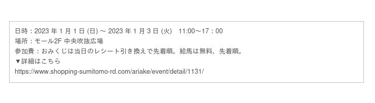 住友不動産商業マネジメント株式会社(本社:東京都新宿区 代表取締役社長:山本 直人)が、運営する複合商業施設「住友不動産 ショッピングシティ 有明ガーデン」(所在:東京都江東区)において実施する、お正月イベントについてお知らせいたします。