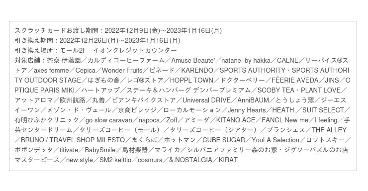 店頭で3,000円(税込)以上の福袋をご購入でスクラッチカードをプレゼント!抽選で99名の方にお買い物・お食事券が当たるチャンス!