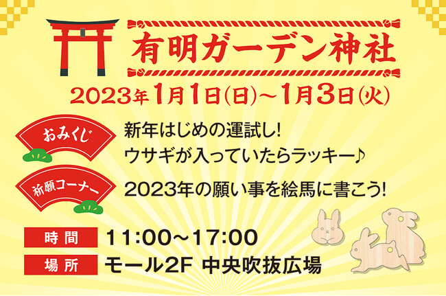 新年の有明ガーデンに神社が登場!ヒノキで作った、有明ガーデンオリジナルの“カプセルトイマシン”でおみくじを楽しめます。当たりのカプセルには干支のウサギをモチーフにしたチャームが入っています!絵馬はイベント終了後、「出雲大社東京分祠」に奉納いたします。