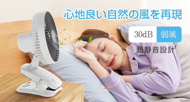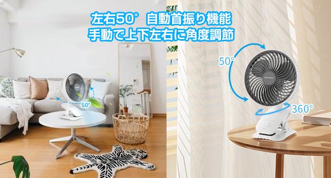 こちらのクリップ扇風機は左右の自動首振り機能を搭載し、風が当たりすぎて困ることはありません。また、手動で、左右に360°回転、上下に50度の調節が可能で、自由にお好みの風向きにすることができます。