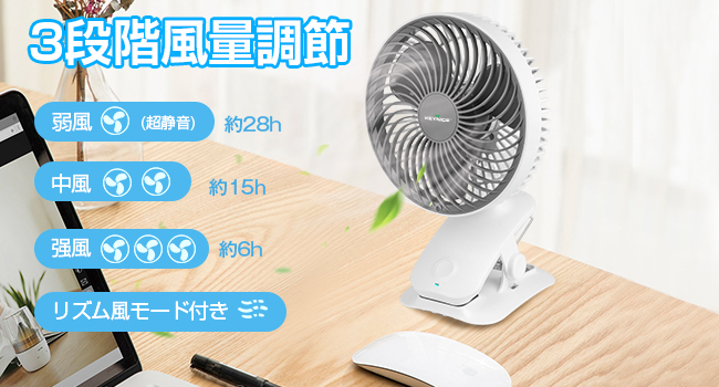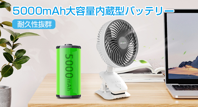 5000mAh大容量電池を採用し、フル充電の場合、弱風モードで約28時間の連続使用ができます。強風モードでも約6時間の連続使用が可能です。卓上扇風機本体には、優れた素材のABS樹脂を採用し、衝撃や高温に強く、耐久性が抜群です。