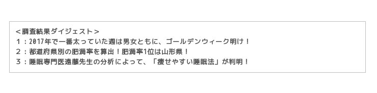 また、「平均体重の年変化」の調査結果からわかるように、年間の体重は、1月から6月が重くなる時期で、7月から12月が軽くなる時期であることがわかります。ゴールデンウィークに体重が一番重くなる理由は、もともと体重が重くなる時期であることに加え、長期休暇によって運動の量が減ったためだと考えられます。