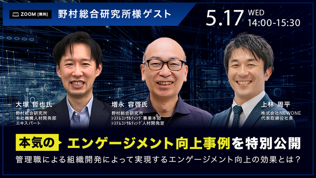 エンゲージメント向上を軸とした組織開発・人材育成コンサルティング支援を行う株式会社NEWONE(本社:東京都千代田区 代表取締役:上林周平、https://new-one.co.jp/ 以下、NEWONE)は、この度、エンゲージメント向上のための組織開発を管理職に導入し、様々な取り組みに挑戦されている野村総合研究所の本社機構人材開発部エキスパート 大塚哲也氏、システムコンサルティング人材開発室 増永 容啓氏のお二人をゲストにお迎えし、「管理職による組織開発によって実現するエンゲージメント向上の効果とは?」をテーマに、2023年5月17日(水)14:00-15:30にオンラインで事例紹介セミナーを実施いたします。