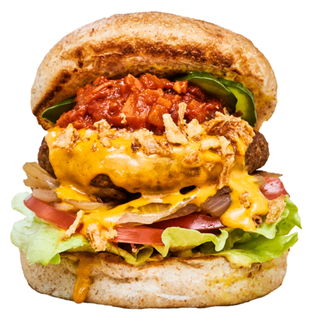 ハンバーガーのボリューム感、色味、ジューシーなパティとパンチの効いたソース、サイドメニューのトルティーヤチップス全てでジャンクさを感じられるハンバーガーをお届けします。