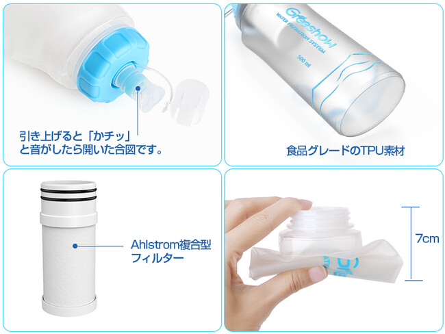 GreeShow携帯浄水器、286浄水ボトルはAhlstromろ過技術を採用しており、細菌、ウィルス、原虫嚢子(のうし)などの除去率は99.9999%、また、有機フッ素化合物(PFOA/PFOS)、バクテリア、重金属、プラスチック粒子などの水に溶けない物質は物理的電荷の吸着によって除去されます。浄水ボトルは高品質の食品レベルのTPUとPP材料を採用し、安心して飲めるほど透き通った清潔な飲料水にろ過することが可能です。