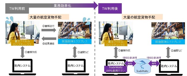 富士フイルムロジスティックス様では、航空貨物の物流・通関手配を行う阪急阪神エクスプレス様との情報連携の更なる効率化・高度化を図るため、自社システムとTradeWaltzのAPI連携を実施。また、阪急阪神エクスプレス様でも自社システムとTradeWaltzのAPI連携を実施いただいたことで、電子情報で物流・通関手配の依頼および、結果の受け取りができるようになり、業務改革が実現しました。