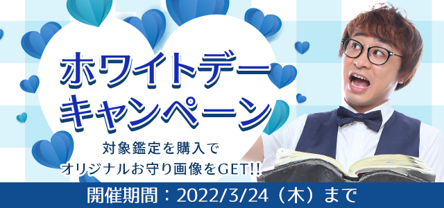 『ホワイトデーキャンペーン』は、日々サイトをご利用のユーザーの皆様への感謝の気持ちを込めて、対象鑑定をご購入された方全員に、当サイトオリジナル「アポロンのお守り」画像をプレゼント。太陽と愛の神様であるアポロンの力を込めた特別なパワーのあるお守りとなっています。お手持ちのスマートフォンに画像を保存し、待ち受け画像に設定していただけます。この機会にぜひ「アポロン山崎の占い」をお楽しみください。