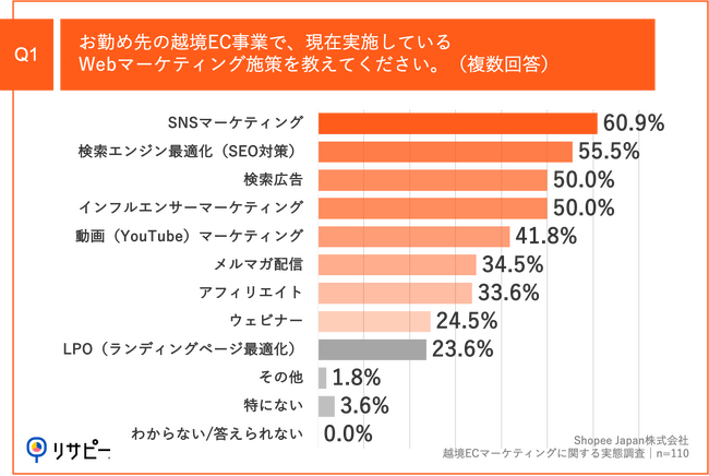 「Q1.お勤め先の越境EC事業で、現在実施しているWebマーケティング施策を教えてください。(複数回答)」(n=110)と質問したところ、「SNSマーケティング」が60.9%、「検索エンジン最適化(SEO対策)」が55.5%という回答となりました。