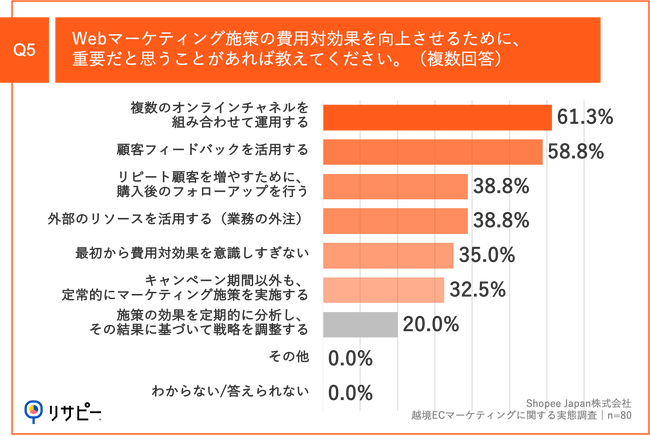 Q3で「かなり感じている」「やや感じている」と回答した方に、「Q5.Webマーケティング施策の費用対効果を向上させるために、重要だと思うことがあれば教えてください。(複数回答)」(n=80)と質問したところ、「複数のオンラインチャネルを組み合わせて運用する」が61.3%、「顧客フィードバックを活用する」が58.8%という回答となりました。