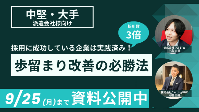 株式会社CastingONE(キャスティングワン、本社:東京都千代田区、代表取締役:野澤 怜司)は、株式会社マルジュと開催したセミナー「採用に成功している企業は実践済み!歩留まり改善の必勝法」の登壇資料を公開したことをお知らせいたします。資料は9月25日(月)まで期間限定で公開する予定です。