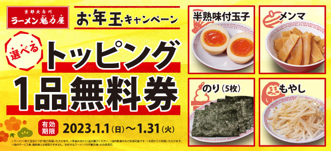 ぜひこの機会に、魁力屋で熱々のラーメンを食べて「選べるトッピング1品無料券」をゲットし、素敵なお正月をお過ごしください。