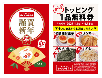 2023年1月1日(日)より、「選べるトッピング1品無料券」を配布します!※各店舗3,000枚、なくなり次第終了