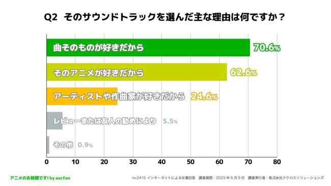Q2 「曲そのものが好きだから」と答えた人が70.6%、僅差で「そのアニメが好きだから」と答えた人が62.6%という結果になりました。