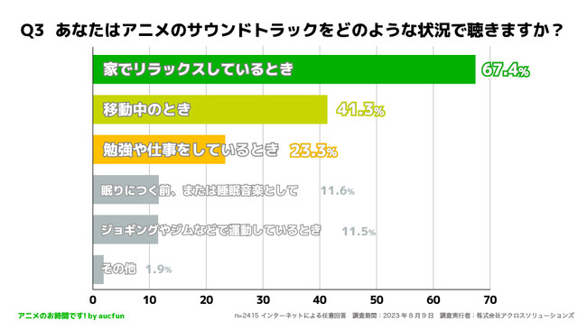 ただし20代においては「移動中のとき」で44.9%、「勉強や仕事をしているとき」は36.5%と、他の年代と比べるとさまざまな状況下でアニメのサウンドトラックを鑑賞する傾向にあります。
