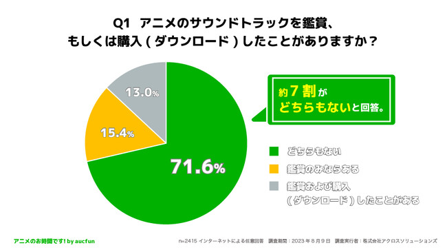 そこで、株式会社アクロスソリューションズと株式会社オークファンが共同運営しているアニメのお時間です!(URL:https://aucfan.com/vod/)は、20歳〜60歳の男女2415人を対象に「アニメのサウンドトラックに関するアンケート調査」を実施しました。