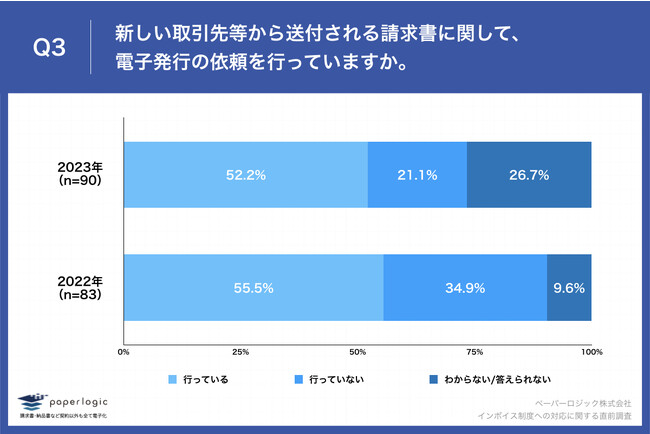 Q2で「全て電子」以外を選択した方に、「Q3.新しい取引先等から送付される請求書に関して、電子発行の依頼を行っていますか。」(n=90)と質問したところ、「行っている」が52.2%、「行っていない」が21.1%という回答となりました。