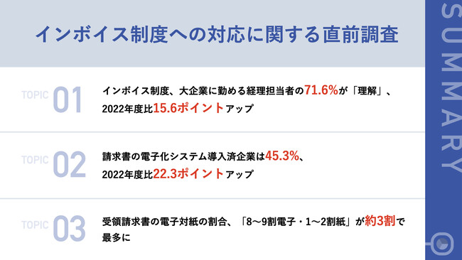 まもなく10月から開始される「インボイス制度」について、71.6%が「理解している」と回答し、2022年度から15.6ポイント上昇したことが分かりました。取引先から受領する請求書の形式としては、「8〜9割電子・1〜2割紙」が27.4%で最多となっています。また、8割以上の担当者が、取引先に対して「紙の請求書を電子にして欲しい」と回答しており、約半数が「紙の処理の方が社内処理上工数がかかるから」を理由に挙げています。