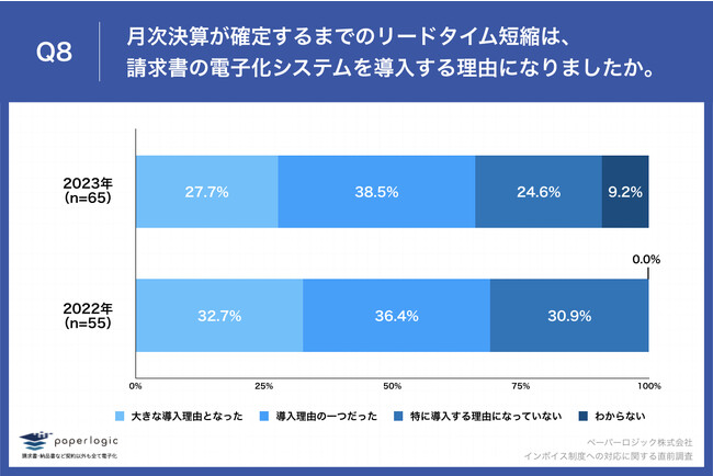 Q7で「行われている」かつQ6で「すでに導入済」「インボイス制度をきっかけとして導入予定」「インボイス制度関係なく導入予定」と回答した方に、「Q8.月次決算が確定するまでのリードタイム短縮は、請求書の電子化システムを導入する理由になりましたか。」(n=65)と質問したところ、「大きな導入理由となった」が27.7%、「導入理由の一つだった」が38.5%という回答となりました。