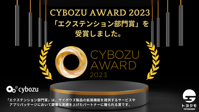 トヨクモ株式会社(本社:東京都品川区 社長:山本 裕次、以下トヨクモ)は、サイボウズ株式会社(本社:東京都中央区、社長:青野慶久、以下サイボウズ)より発表された「CYBOZU AWARD 2023 (サイボウズ アワード 2023)」において、「エクステンション部門」を受賞したことをお知らせいたします。