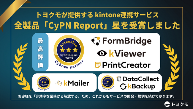 トヨクモでは、サイボウズのパートナー評価制度「Cybozu Partner Network Report(通称:CyPN Report(サイパンレポート)」の評価基準にて、kintone連携サービス6製品全てで星を獲得いたしました。また、「フォームブリッジ」「kViewer」「プリントクリエイター」の3製品で最高評価の3つ星を獲得した事から、複数製品における導入数や顧客満足度などを総合的に評価いただき、今回の「エクステンション部門賞」を受賞できたと考えております。