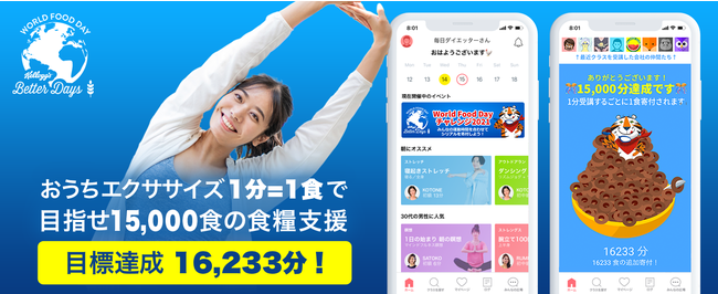 10月16日(土)の「世界食糧デー」にあわせ、10月14日(木)〜11月14日(日)まで「ケロッグ World Food Day チャレンジ 2021」を実施しました。自宅からも参加できる新しい従業員ボランティアの取り組みとして、運動習慣化支援アプリ“Beatfit”を活用した「バーチャルボランティアプログラム」で、社員が行ったエクササイズ1分をシリアル1食分に換算し、目標の期間合計15,000食の寄付に対し、16,233食の寄付を達成し、子ども食堂への寄贈につなげることができました。