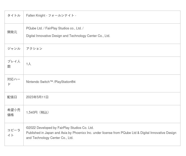 株式会社Phoenixx(フィーニックス)(東京都武蔵野市、代表取締役社長:坂本 和則)は、『Fallen Knight - フォールンナイト -』のNintendo Switch(TM) /PlayStation(R)4版を、2023年5月11日(木)に配信決定したことをお知らせいたします。