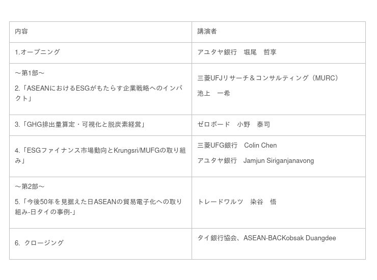2023年で50周年を迎える日ASEAN友好協力関係は、政治に限らず、経済、文化、スポーツ等、幅広い分野に渡っています。その一環として行われた今回の日タイ共同ウェビナーは、アユタヤ銀行および三菱UFJリサーチ&コンサルティング(MURC)の共催により、今後の日ASEANの協力分野となりうる「ESG」、「貿易電子化」、「GHG排出可視化」をテーマとして、日タイでの事例を用いつつ、それぞれの分野の専門家による講演を行いました。